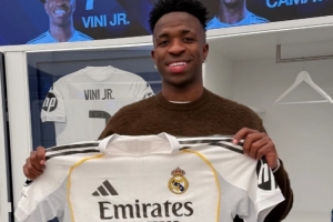 维尼修斯达成为皇马出战350场比赛里程碑,赛后他在社交媒体上晒出与纪念球衣的合照。