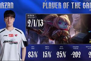 体育资讯1月18日讯 LPL第一赛段组内赛AL击败JDG扳平比分,Tarzan波比打出2-1-13的战绩斩获第二局MVP!