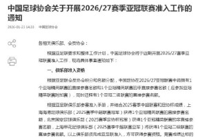 中国足协开展2026-2027赛季亚冠联赛准入工作。2026-27赛季亚冠赛事中国足协有1+1+1个亚足联俱乐部赛事名额,上海海港、北京国安、上海申花此前已经分别获得了亚冠精英联赛、亚冠精英联赛附加赛和亚冠二级联赛参赛资格。根据亚冠准入规定,除处于处罚期内的山东泰山外,其他前8名俱乐部成都蓉城、天津津门虎、浙江、云南玉昆也可以自愿申请亚冠赛事的准入,当前序球队准入未通过时,通过准入的球队将依次递补。只有同时达成竞赛成绩并获得准入牌照的球队,才能最终将代表中国参加下赛季亚冠精英联赛和二级联赛。