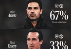 在阿尔特塔执教期间,阿森纳在英超对阵曼联的战绩已经显著提高,达到67%,埃梅里33%,温格27%。