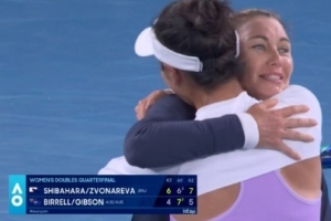 体育资讯1月28日讯 澳网女双1/4决赛,柴原瑛菜/兹沃娜列娃以2-1险胜外卡组合比勒尔/吉布森,锁定最后一个四强席位。