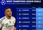 #本菲卡4比2皇马# 本场比赛姆巴佩打入2球,这使得他本赛季欧冠进球数达到13粒,进入单赛季欧冠进球记录前十,距离排名第一的C罗(13/14赛季)只差4球。