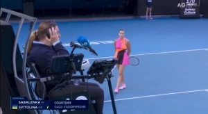 第三局第一分,主裁认为萨巴伦卡在击球过程中过早喊叫,干扰到了斯维托丽娜,所以把这分直接给了对手。萨巴伦卡申请视频回放挑战,但也没有成功。
