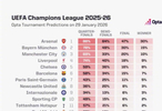 本赛季欧冠联赛阶段的比赛已经全部结束,著名数据机构OPTA也更新了欧冠各支球队的夺冠概率。