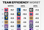联盟前10和倒10的净效率、进攻效率以及防守效率排名。第一的雷霆净效率+15.6、倒一的奇才-15.7,这意味着雷霆赢奇才30分,都是打的差的了。