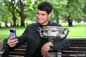 体育资讯2月2日讯 ATP官方晒图,阿尔卡拉斯拍摄澳网冠军写真。