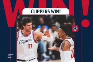 赛后快船官方发布赢球海报,封面为洛佩斯和科林斯击掌瞬间。