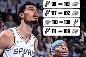 ESPN晒出了本赛季雷霆和马刺交手纪录(雷霆1-3马刺),写道:“本赛季常规赛双方最后一次交手,雷霆将客战马刺,谁能赢?”