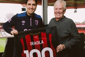 伯恩茅斯主席向主教练伊劳拉赠送了英超百场纪念球衣,43岁的伊劳拉在2023年7月成为伯恩茅斯主教练,他在100场英超比赛中带队取得36胜29平35负的战绩,期间打入152球,丢156球,拿到137分。