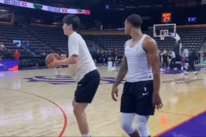 赛前,撕裂之城混音球员们进行投篮热身,杨瀚森三分试投2投1中。