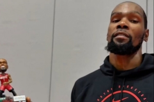 视频中杜兰特介绍摇头娃娃细节。官推表示,今天前3000名入场的球迷将获赠娃娃。