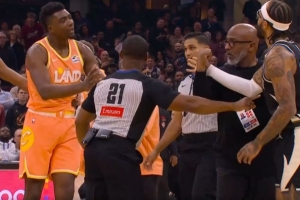 GIF-布莱恩特挡人时推倒特伦特引发冲突