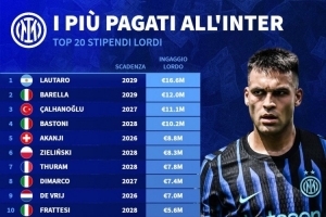 体育资讯11月18日讯 德国转会市场统计了国米球员的税前年薪,并列出榜单,劳塔罗1660万欧居首,巴雷拉、恰尔汗奥卢二三位。