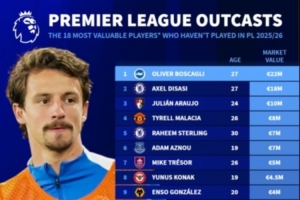本赛季英超未出场球员身价榜:博斯卡利2000万欧居首,迪萨西第二