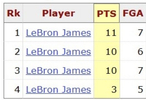 詹姆斯昨天只出手7次,是他生涯单场出手次数第三少。最少的是5次,发生在2004年。其余的6次与7次出手均发生在湖人时期。