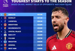 曼联前11轮的对手平均身价6.1亿欧排名第一;伯恩利对手平均身价为5.71亿欧排第二;利物浦的对手平均身价为5.41亿欧排第三。