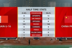 体育资讯11月22日讯 U17亚预赛第一轮,国少队半场3-0领先巴林队,数据方面,国少队半场13射4正3进球,对手0射门。