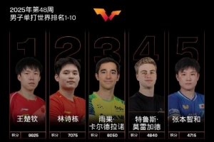 男单排名方面,中国队球员王楚钦、林诗栋位列前二,梁靖崑位列第七。其他国乒球员,向鹏排名第11,陈垣宇排名第24,周启豪排名第38,陈俊菘排名第45,黄友政排名第48。