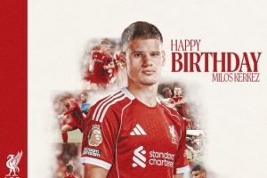 利物浦官方社媒晒出为凯尔凯兹制作的生日海报,配文:“祝你度过美好的一天,米洛斯。”