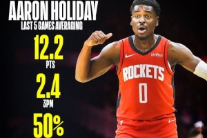 阿隆·霍勒迪近5场比赛场均12.2分,投进2.4个三分,三分命中率50%(24中12),场均正负值+7.4。