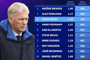 体育资讯11月26日讯 德国转会市场统计了英超主帅执教场次排名,莫耶斯728场排名第三,有望追赶弗格森和温格。