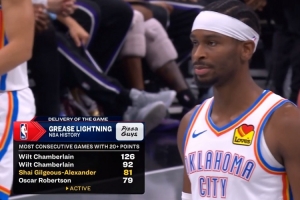 截至发稿,亚历山大第三节4投4中拿到9分,三节18投10中贡献24分,这也是亚历山大连续第82场得分20+。