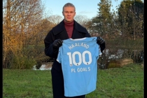 哈兰德本人更新社媒,晒出自己的英超百球曼城特制纪念球衣。