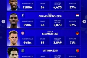 维蒂尼亚(巴黎,25岁,葡萄牙):身价9000万欧,68场,5373分钟,对抗成功率78%