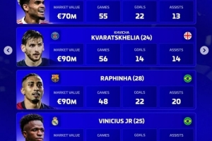 克瓦拉茨赫利亚(巴黎,24岁,格鲁吉亚):身价9000万欧,56场,14球,14助攻