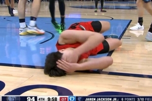 "倒地不起之后,裁判并没有吹停比赛。根据规则,在这种情况下比赛通常不会被叫停。我记得卡梅隆·安东尼曾经也有过类似的情况,他在一次比赛中脸部被击中后倒地,几乎整整一分钟的比赛时间内都躺在地上,期间双方进行了多次攻防转换。这时除非教练叫暂停,否则比赛一般不会因此中断。有时候裁判会吹停比赛,但如果球员没有妨碍到比赛进行,他们通常不会这么做。像这样的情况,比赛还是会继续进行,直到出现自然的停顿或者有人叫暂停。如果没有的话,裁判也没有义务必须吹停比赛。我并没有觉得裁判在操控比赛。