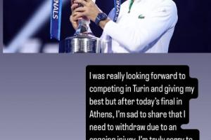 德约科维奇在声明中说到:“我原本非常期待在都灵参赛并尽我所能,但今天在雅典的决赛之后,我很遗憾地宣布,由于伤病我不得不退出比赛。对于希望看到我参赛的球迷们,我深感抱歉,你们的支持对我来说意义重大。祝愿所有参赛球员都能取得好成绩,我迫不及待地想尽快回到赛场与大家重聚!”
