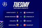 【欧冠赛果】 今天凌晨结束的#欧冠联赛# 第6️⃣轮第①比赛日赛果。