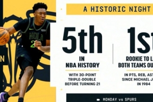 第5位21岁前砍下30+三双的球员,比肩詹姆斯、东契奇、文班和福克斯