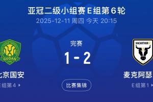 体育资讯12月11日讯 亚冠二级小组赛E组第6轮,北京国安1-2输给麦克阿瑟FC,本轮中超球队亚冠赛场表现,海港、蓉城战平,国安、申花失利。