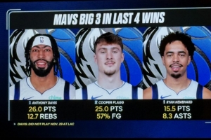赛前,转播方给出独行侠过去4场胜利,浓眉、弗拉格、小纳姆哈德三人组的数据:
