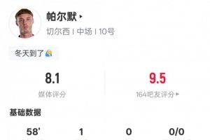 体育资讯12月14日讯 2025-26赛季英超联赛第16轮,切尔西主场迎战埃弗顿。帕尔默首发出战,1次射门1次射正打进1球,送出2次关键传球,评分8.1。