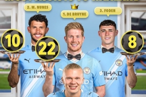 曼城助攻哈兰德次数排名: