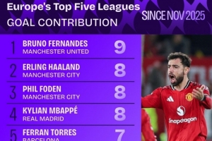 据Squawka统计,B费今年11月以来联赛参与9粒进球,五大联赛同期参与进球最多。