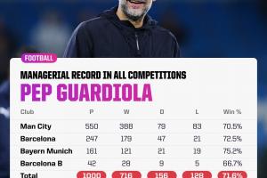 执教生涯1000场比赛,瓜迪奥拉取得了716胜156平128负的战绩,胜率超过7成。