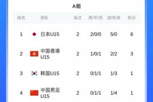 A组积分榜,日本U15两连胜小组第一,中国香港U15两场1胜1负第二,韩国U15两场1负1平第三,国少两场1负1平继续垫底。