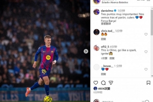 奥尔莫社媒晒出比赛照片,配文:“非常重要的三分,巴萨球迷们,咱们休赛期之后见,加油巴萨!”