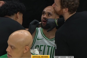 GIF-内姆哈德上篮一肘打到怀特下巴,后者嘴巴出血