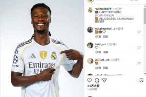 皇马官方社媒晒出卡马文加的照片,配文:“生日快乐,卡马文加!”