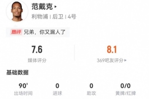 体育资讯12月28日讯 利物浦在本轮英超对阵狼队,范戴克本场数据如下: