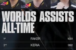 体育资讯11月11日讯 今日赛事官方统计世界赛助攻榜,Faker第一,Keria即将破千!