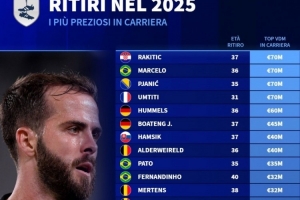 2025年退役球员历史最高身价榜:拉基蒂奇、马塞洛7000万欧居首