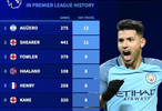 北京时间11月11日,德转统计出了英超历史完成帽子戏法次数最多的10名球员,阿圭罗以12次排名第一,阿兰-希勒11次第二,哈兰德8次位列第四。