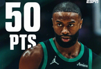 今天的布朗火力全开,出战35分钟,26投18中,三分10中6,罚球10中8,轰下50分3篮板5助攻,正负值+21,统治力拉满。
