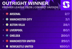而著名媒体Squawka也统计了本赛季英超夺冠赔率,阿森纳仍然领跑,曼城第二,维拉第三。