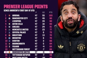阿莫林执教曼联以来47场联赛拿到58分,英超同期排名第14位